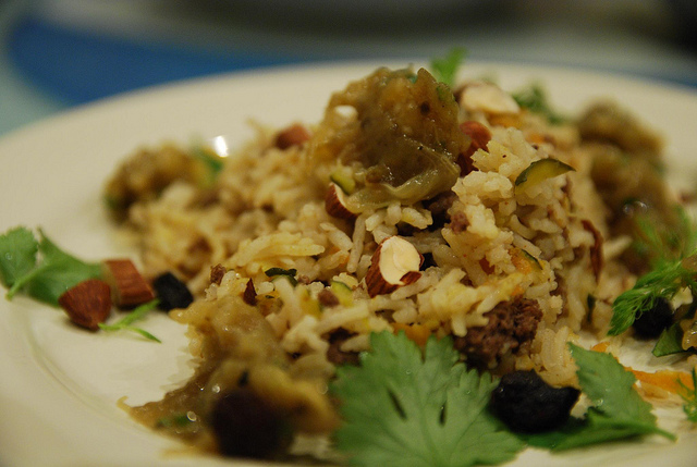 Riz Basmati avec écorces d’orange, pistaches et amandes, avec ou sans poulet